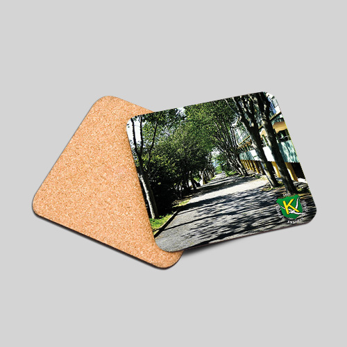 Taş zemine baskılı bardak altlıkları. Okul çamlığı ve ağaçlıklı yol baskılı.