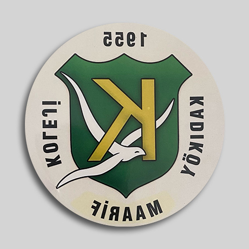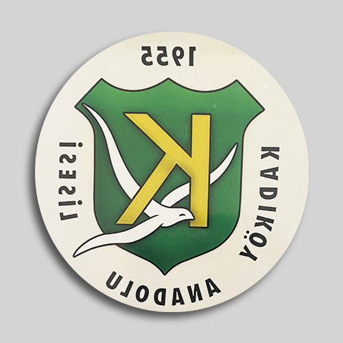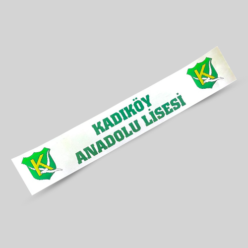 Araba camına içten yapışan dikdörtgen sticker. Sağ ve solda KAL logosu var. Kadıköy Anadolu Lisesi yazılı sticker.