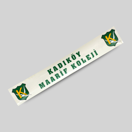 Araba camına içten yapışan dikdörtgen sticker. Sağ ve solda KAL logosu var. Kadıköy Maarif Koleji yazılı sticker.
